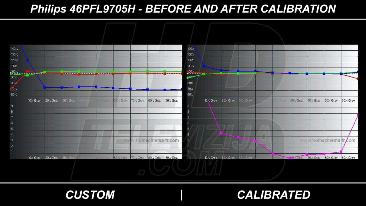 Za sve predloške dobili smo položaj primarnih i sekundardnih točaka značajno van referentnog trokuta za HDTV Rec 709 specifikaciju, što znači da je ovaj televizor u stanju prikazati širi raspon boja (gamut) od onih koje su deklarirane standardnom. Ovo je ujedno i glavni razlog zbog kojeg 46PFL9705H prikazuje intenzivne boje i razne nijanse inače nevidljive na televizorima manjeg broja bitova matrice.