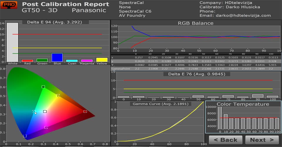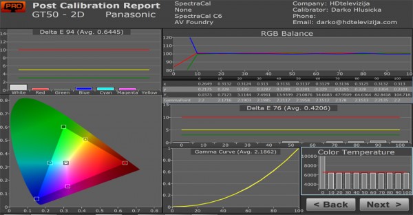 Osim Dynamic, Normal i Cinema predložaka koji su standardni kod svih televizora, snaga GT50 modela leži u onima s oznakom THX, te Professional 1 i 2 predlošcima za one koji žele ručno podešavati sve parametre slike. Za one koji ne planiraju kalibrirati televizor već žele najprecizniju sliku “ravno iz kutije”, THX Cinema za noćno, odnosno THX Bright Room za dnevno gledanje su najbolji izbori iz više razloga. Za početak, THX Cinema ima najveći kontrast od svih predložaka, uz najdublju crnu boju. Kroz Professional predloške smo pokušali dostići tu razinu no nismo u tome uspjeli. Gamma je također vrlo pravilna i iznosi 2.192 što je vrlo blizu referentnih 2.20, a Delta E 1976 greške u RGB balansu su u prosjeku 3.11 – cilj je biti ispod 3, a THX Cinema predložak to uspijeva u nižem spektru ispod 50% svjetline. Preciznost boja je također na razini uz Delta E 1994 greške od 2.24 (cilj kalibracije <3), a raspon boja je također precizan osim kod zelene i crvene koje su blago prezasićene.