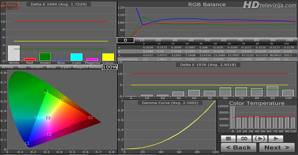 Professional predložak je ostvario značajno lošiju vrijednost crne boje od 0.0337 cd/m2, uz svjetlinu od 102.1 cd/m2, što je kontrast od 3030:1. Iako Professional predložak manje DeltaE greške za RGB balans i boje, slabija vrijednost crne umanjila je naš entuzijazam da uđemo u kalibraciju s ovim predloškom, no to smo ipak učinili kako bismo provjerili kako funkcioniraju dostupne kontrole.