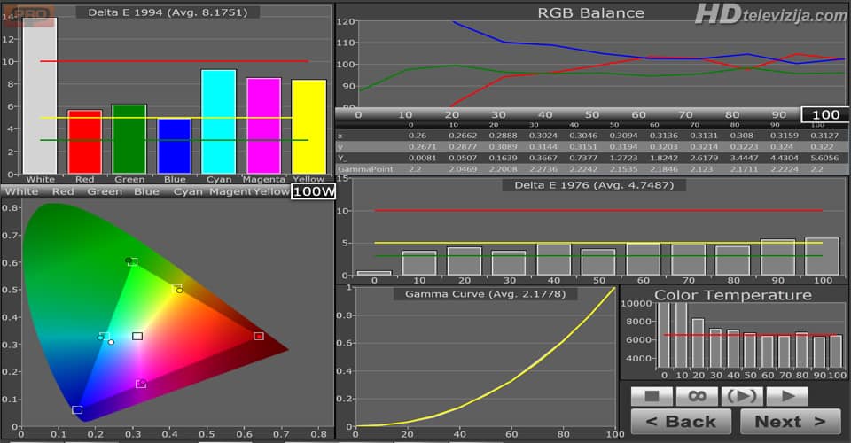 Provjera karakteristika slike i kalibracije je izvršena putem SpectraCalovog Calman Professional softvera, X-Rite SpectraCal C6 kolorimetra i AVFoundtry VideoForge generatora uzoraka.