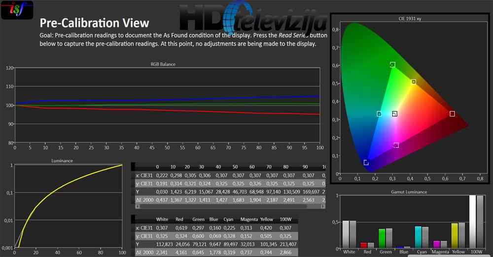 Doista, praktički svih ključni aspekti su gotovo kao nakon precizne kalibracije, s minimalnim odstupanjima preciznim rasponom boja. Gamma je već tvornički bila 2.2, te poputno ravna od početka do kraja, što je jedan od ključnih faktora dobro ujednačene i prirodne slike. Cinema 1 i 2 predlošci unutar istoimene scene imaju gammu bližu vrijednosti 2.4 što je bolji odabir za gledanje u potpunom mraku, dok za uobičajeno gledanje s varijabilnim količinama svjetlosti u prostoriji, preporučujemo gammu 2.2.
